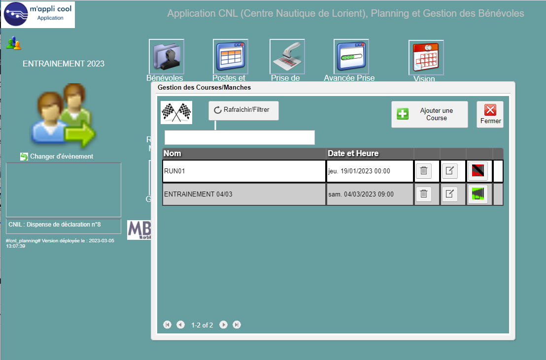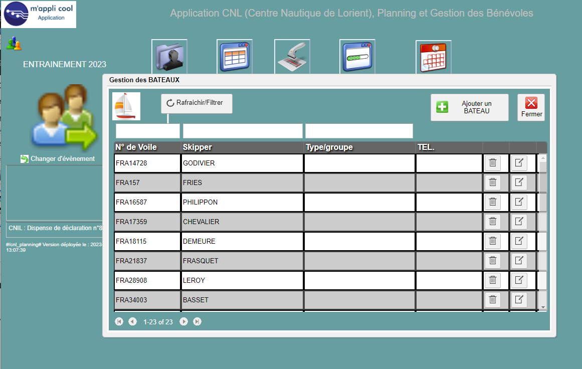 La deuxième est une application WEB qui permet de déclarer les bateaux (N° de Voile) et les courses (ou entrainements). Cette application est sous le contrôle unique de l'équipe du CNL.